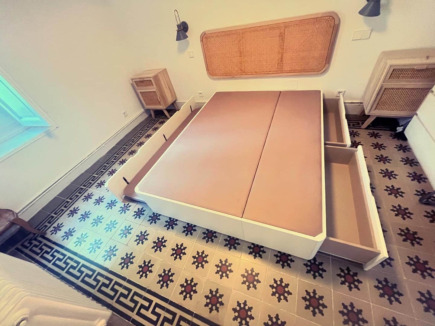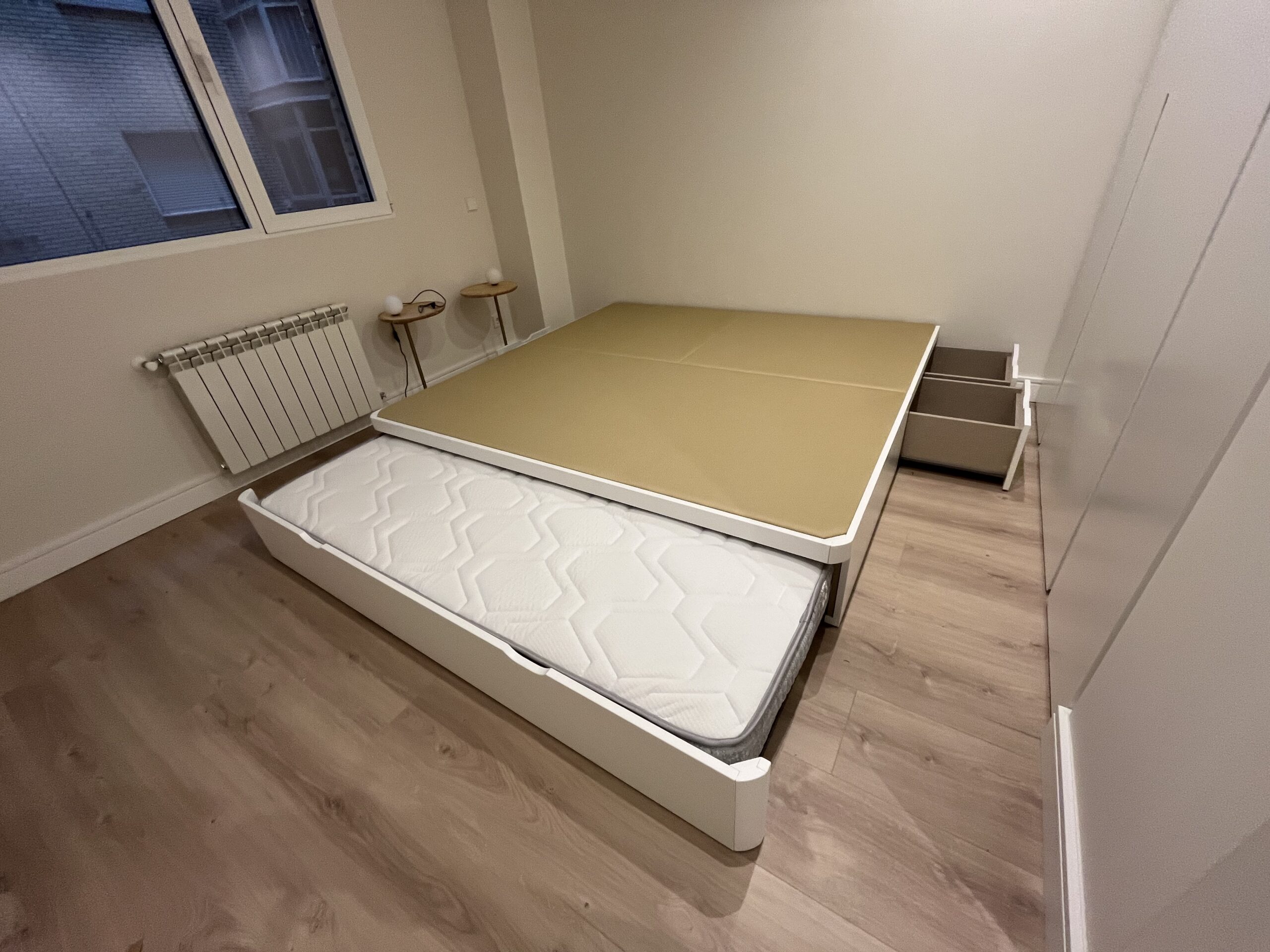 Nuestros cajones laterales están diseñados para ser prácticos y duraderos. Utilizamos guías de alta resistencia que permiten un deslizamiento suave y silencioso. Son perfectos para almacenar desde edredones pesados hasta libros, manteniendo siempre su estructura intacta gracias al refuerzo artesanal.