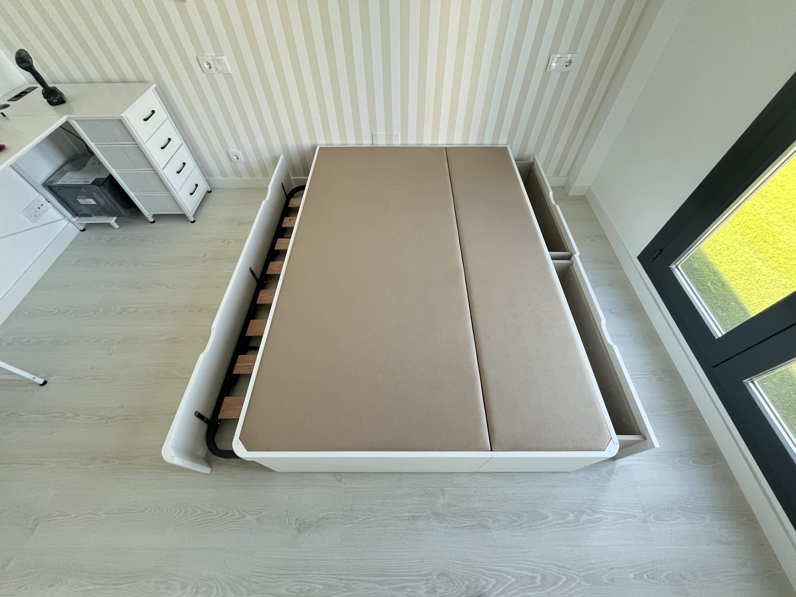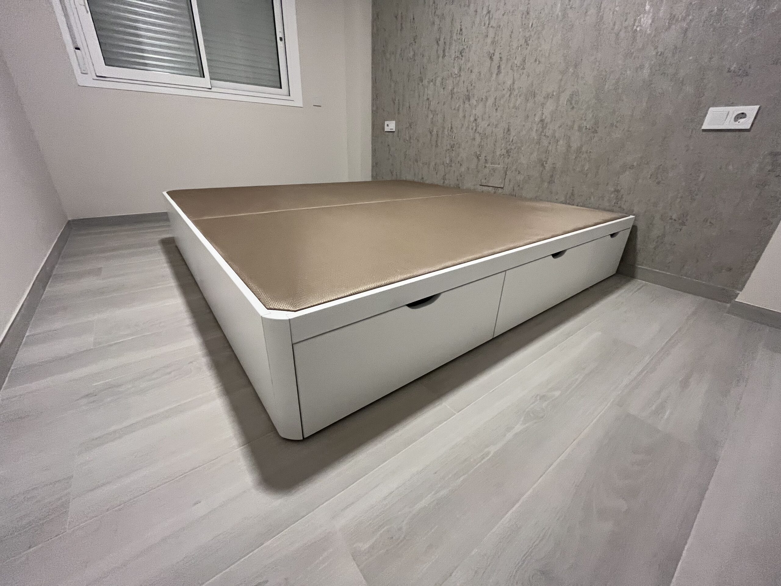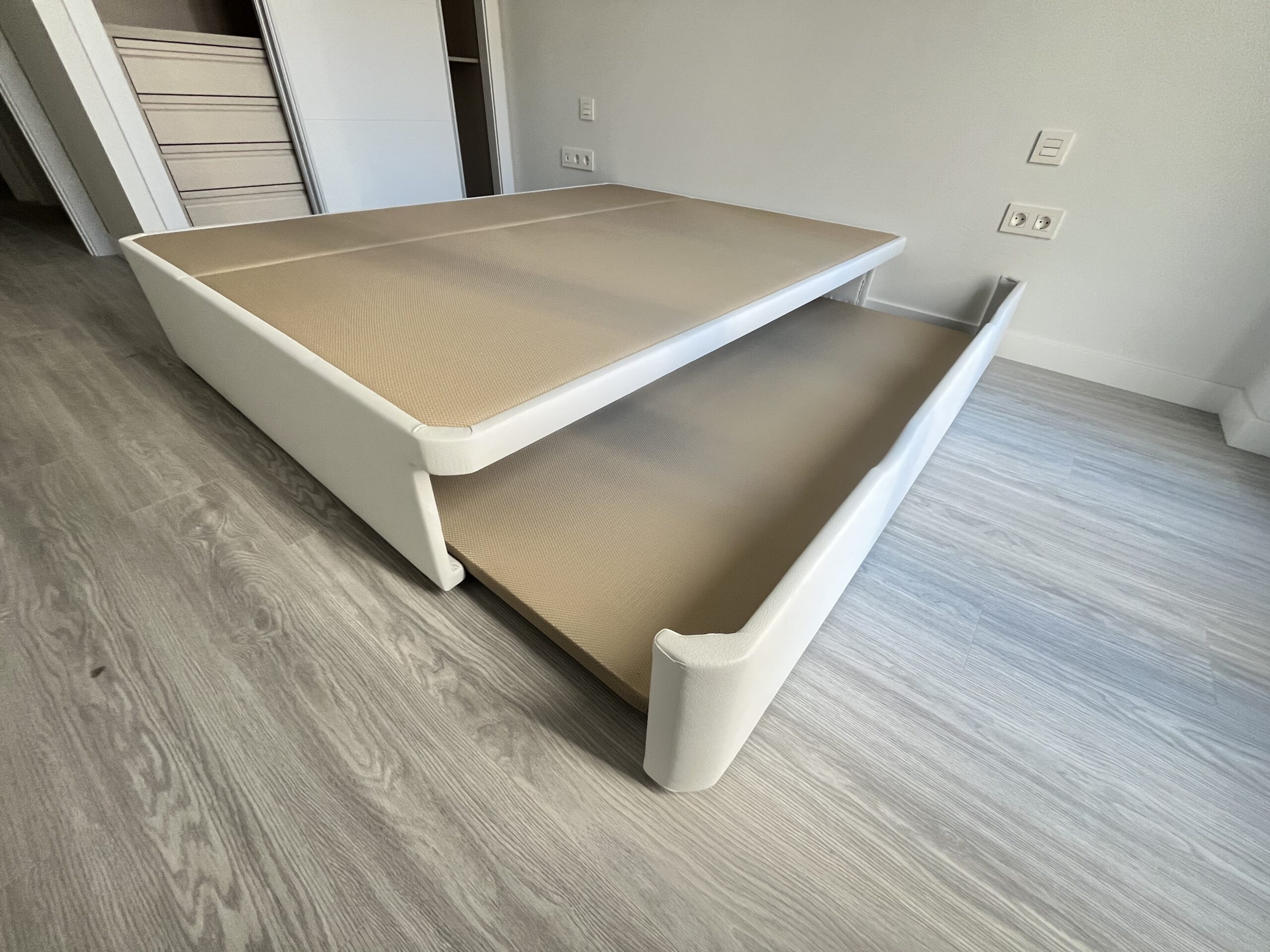 Nuestros cajones laterales están diseñados para ser prácticos y duraderos. Utilizamos guías de alta resistencia que permiten un deslizamiento suave y silencioso. Son perfectos para almacenar desde edredones pesados hasta libros, manteniendo siempre su estructura intacta gracias al refuerzo artesanal.